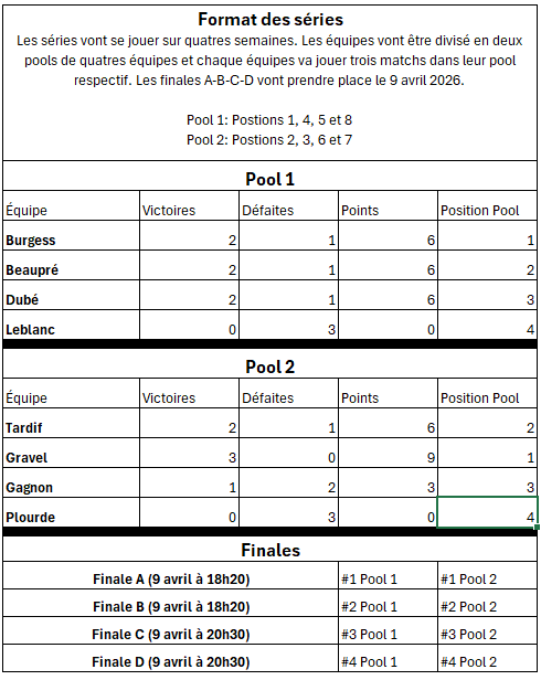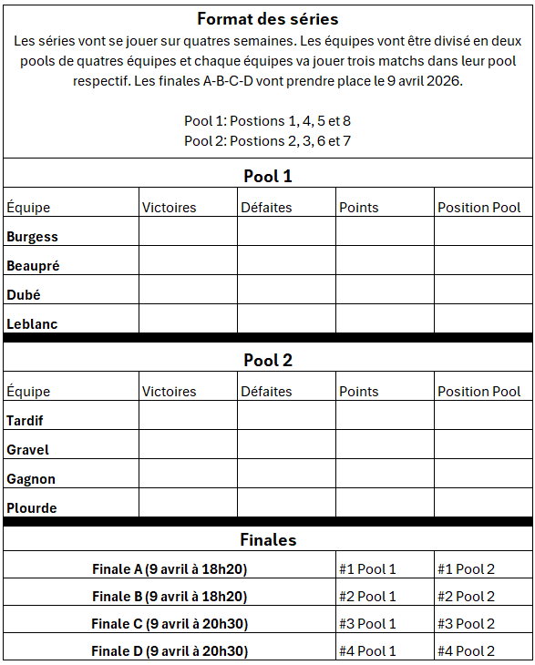 Cette ligue est composée des meilleures équipes du club. Elle représente le niveau le plus compétitif offert au club. Afin de la rendre accessible et plaisante pour les équipes désirant compétitionner, elle est divisée en deux groupes (divisions A et B). La saison débutera avec un "round robin" de 7 parties qui déterminera la position de chacune des équipes. Les 4 meilleures seront classées dans la division A et les 4 autres dans la B. Par la suite, les équipes de chacune des divisions joueront entre elles pour 3 parties (1 x chaque équipe) et un reclassement sera fait. Les deux premières équipes au classement de la division B monteront dans la division A pour prendre la place de les deux dernières équipes au classement du A qui elles descendront dans le B.